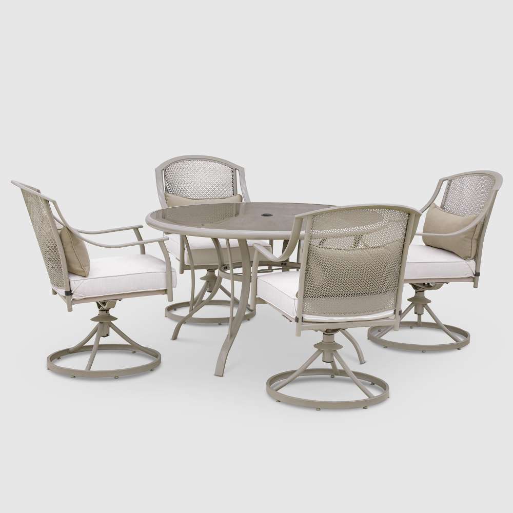 Цвет каркаса:Бежевый|Цвет обшивки:Белый, Бежевый|Количество предметов:5|Комплектация:Стол - 1 шт., стул - 4 шт.|Материал каркаса:Сталь|Материал обшивки:Полиэстер|Основной материал:Металл|Особенности:Стулья с поворотной конструкцией, размер трубы подлокотника - 36х14 мм., тип стали - Q195 с порошковым покрытием, размер подушки сиденья - 52х52х8 см., размер декоративной подушки - 50х26х12 см., материал подушек - 100% полиэстер 200 г/м2.|Страна-производитель:Китай|Размер стола (ДхШхВ):122х70|Размер стула (ДхШхВ):67х56,5х88,5|Рекомендации по уходу:Протирать влажной тряпкой или щеткой без использования абразивных чистящих средств, соблюдать плавила эксплуатации и температурный режим от +5 до +40 градусов (инструкция по правилам прилагается к мебели).|Остатки только по МФ:0|Требуется сборка:0|Тип товара:Комплект мебели|Срок гарантии (в месяцах):3