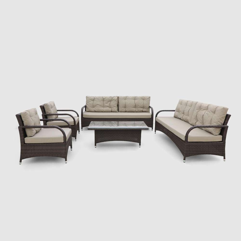 Цвет каркаса:Коричневый|Цвет обшивки:Бежевый|Количество предметов:5|Комплектация:Диван - 2 шт., кресло - 2 шт., столик - 1 шт.|Материал каркаса:Алюминий, ПВХ|Материал обшивки:Ткань|Основной материал:Искусственный ротанг|Страна-производитель:Азербайджан|Размер дивана (ДхШхВ):190х75х71|Размер кресла (ДхШхВ):83х75х71|Размер стола (ДхШхВ):120х60х45|Рекомендации по уходу:Протирать влажной тряпкой или щеткой без использования абразивных чистящих средств.|Срок службы:Не ограничен.|Остатки только по МФ:0|Требуется сборка:0|Тип товара:Комплект мебели
